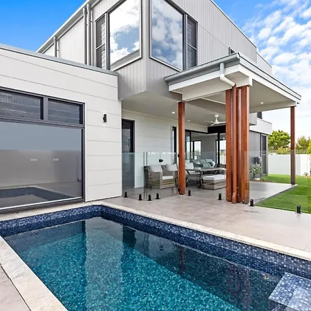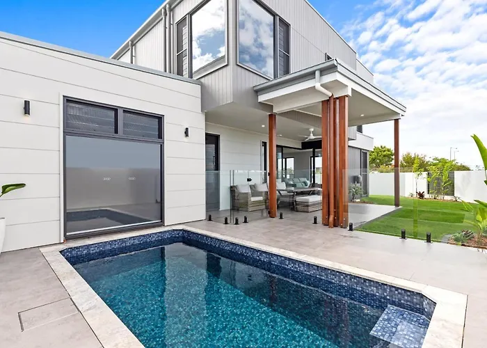 4 Bedroom Home In Pelican Waters With Heated Inground Pool biedt een dompelbad voor een ontspannen ervaring en bevindt zich op circa 4 km van het Happy Valley. Het vakantiehuis biedt mogelijkheden om windsurfen, fietsen en vissen in de omgeving, op circa 10 minuten met de auto van het Queensland Air Museum.